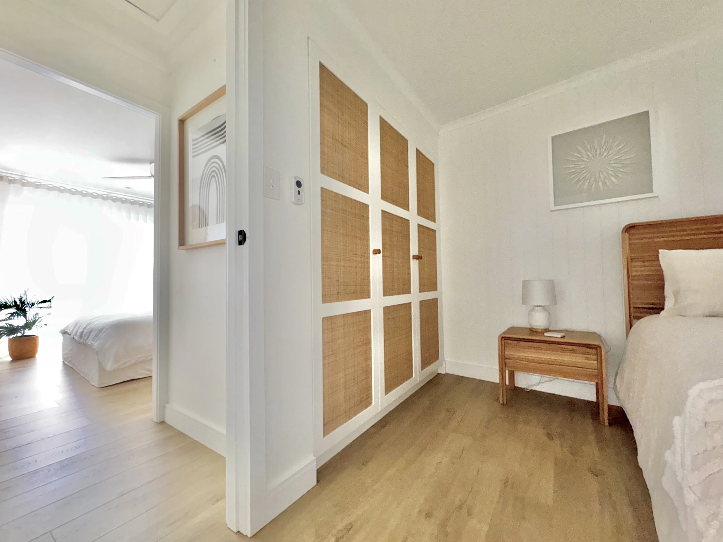A bedroom with white walls, a wooden bed with white linens, a wooden nightstand with an alarm clock and lamp, a built-in wardrobe with rattan panels, and a window showing a bright room with a potted plant and another bed.
